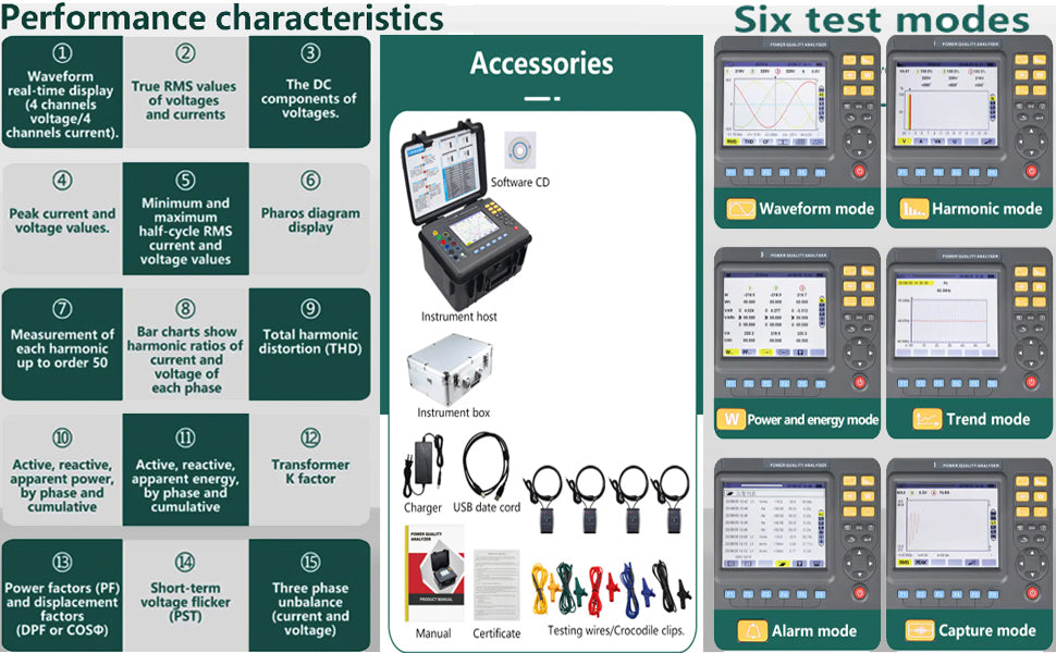 Can simultaneously measure the 4-channel current (ABC three phase and neutral wire current), 4-channel voltage (ABC three-phase voltage and neutral line voltage to ground), the peak value of current voltage, maximum/minimum value over a period, three-phase imbalance factor, short-time voltage flicker, transformer K factor, active power, reactive power, apparent power, power factor and displacement power factor, total harmonic distortion and harmonic, etc;