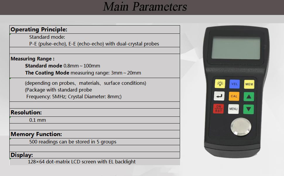 *Operating Principle: Standard mode: P-E (pulse-echo) method with dual-crystal probes; Coating mode: E-E(echo-echo) method with dual-crystal probes