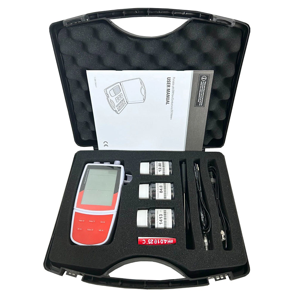 Portable multiparameter water quality meter is equipped with a backlit LCD display.