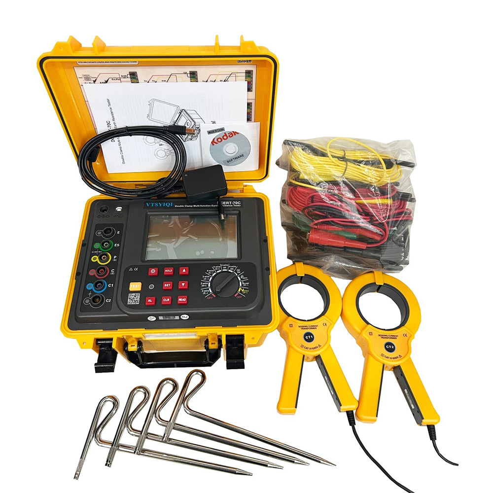 Double Clamp Earth Resistance Tester consists of a host, a current clamp (double clamp), data software, a test line, an auxiliary earth rod, and a communication line, etc.