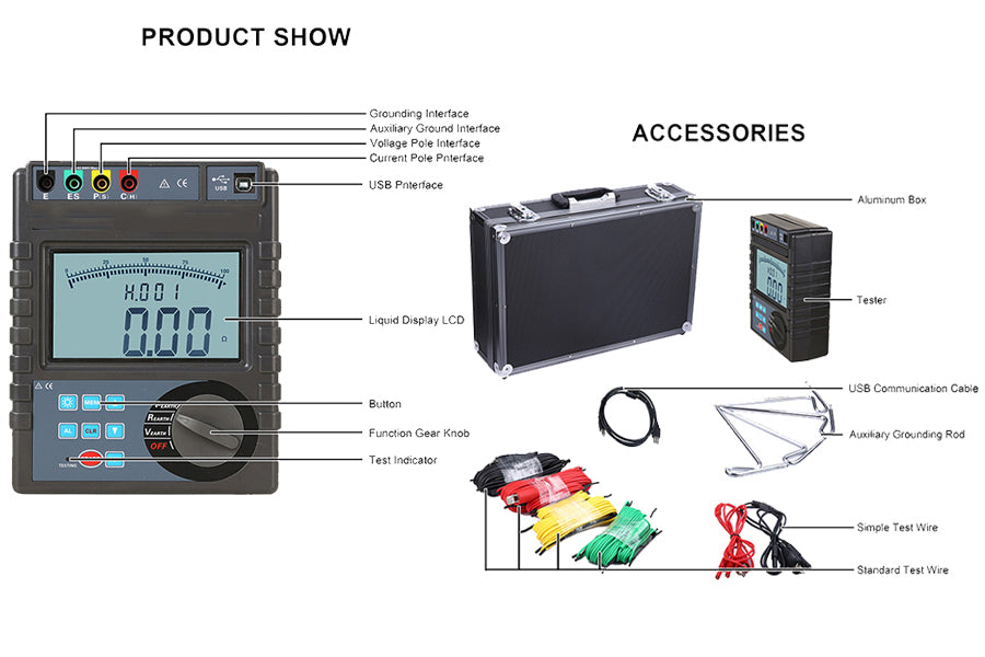 Accessories:Tester:1PC; Ground stake: 4PCS; Test line:4PCS; Simple test line:2PCS; USB special communication cable:1PCS; Tester case:1PCS; LR14 battery: 6PCS