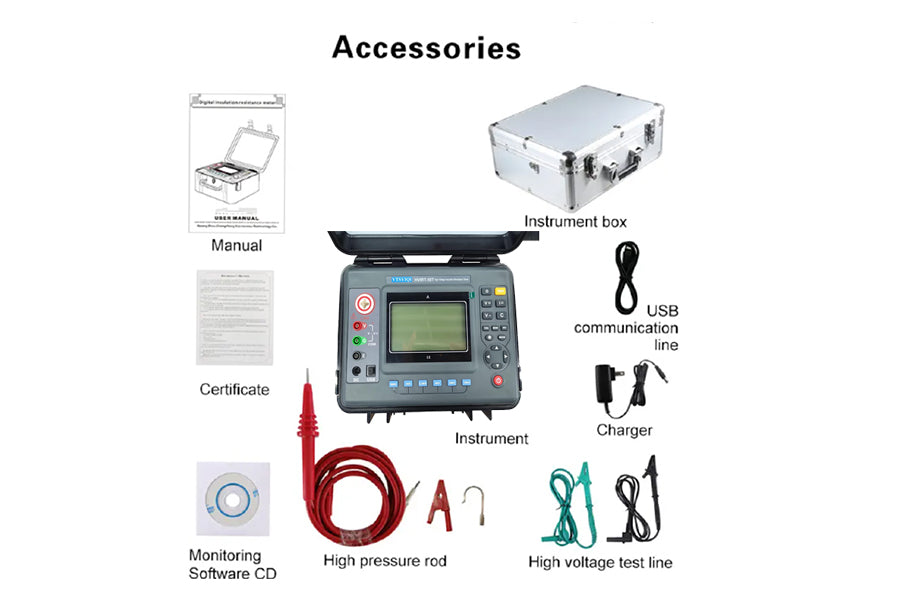 USB Connect---Communication Line:USB communication line 1PC Test Line:High voltage rob red 3meter, high voltage test line black 1.5meter, green 1.5meter Data Storage:500 groups, "FULL" symbol indicates that storage is full Data Review:Data review function: "MR" symbol display