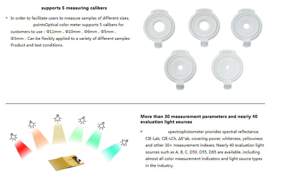 Horizontal spectrophotometer, High repeatability accuracy: dE*ab≤0.02; Horizontal press measurement, physical positioning observation window; More than 30 chroma indicators and 40 evaluation light sources to meet the special needs of users; to meet the user's different sample size measurement scenarios