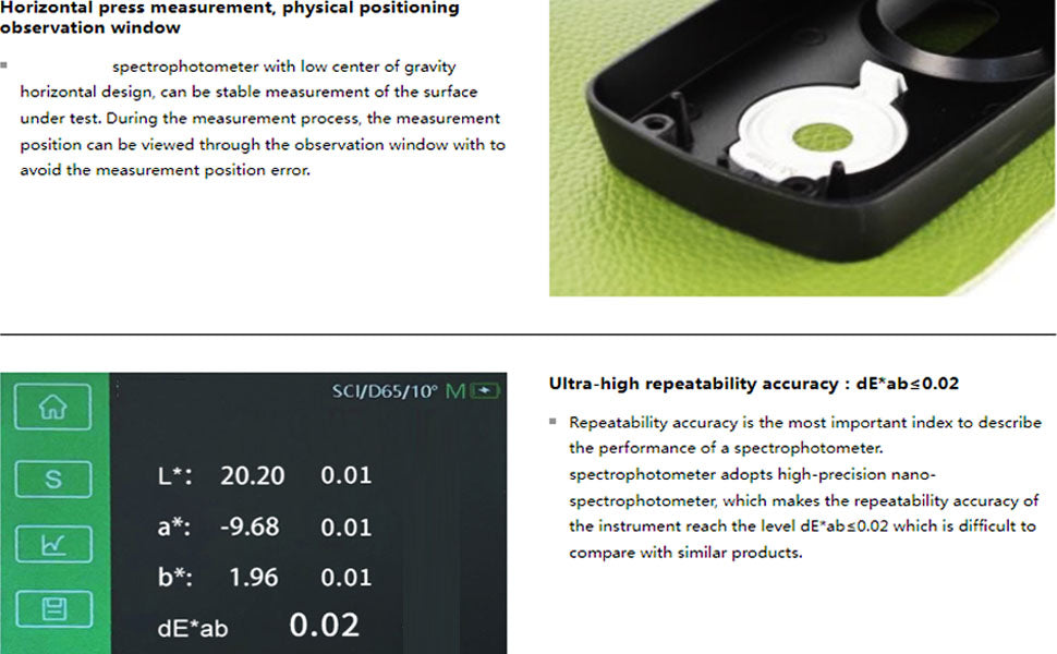 Ultra-high repeatability accuracy:dE*ab≤0.02 Repeatability accuracy is the most important index to describe the performance of a spectrophotometer. spectrophotometer adopts high-precision nano-spectrophotometer, which makes the repeatability accuracy of the instrument reach the level dE*ab≤0.02 which is difficult to compare with similar products.