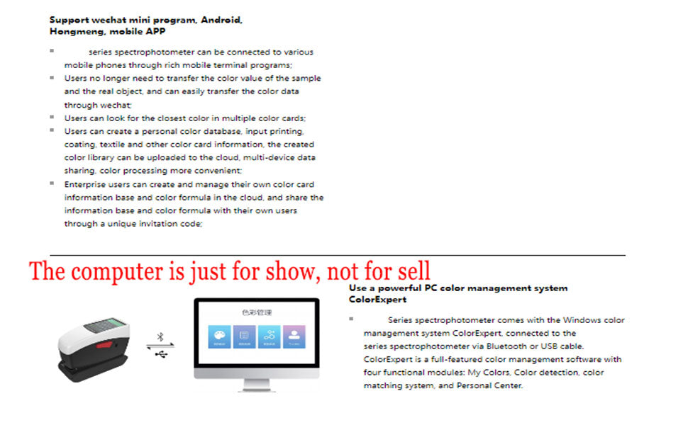 Use a powerful PC color management system ColorExpert spectrophotometer comes with the Windows color management system ColorExpert, connected to the spectrophotometer via Bluetooth or USB cable. ColorExpert is a full-featured color management software with four functional modules: My Colors, Color detection, color matching system, and Personal Center.