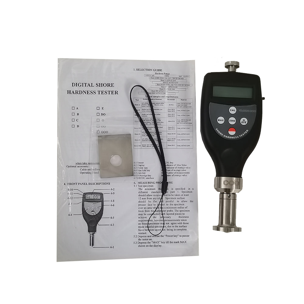 Optional Accessories:Shore Hardness Tester Measurement Stand,Rubber Hardness Test Block(A/D Type),USB Data Cable with Software,Bluetooth Data Adapter with Software