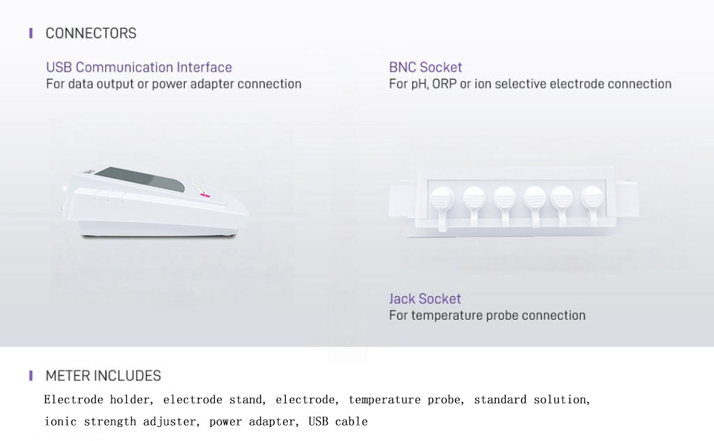 Setup menu allows setting the number of calibration points, ionic valency, stability criteria,temperature unit, auto-power off, etc