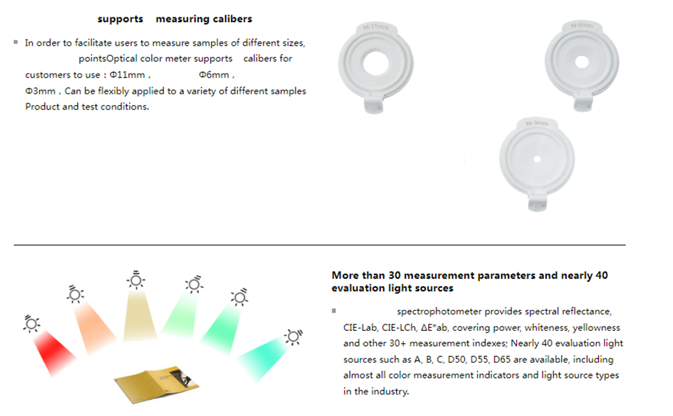 Horizontal spectrophotometer, High repeatability accuracy: dE*ab≤0.02; Horizontal press measurement, physical positioning observation window; More than 30 chroma indicators and 40 evaluation light sources to meet the special needs of users; to meet the user's different sample size measurement scenarios