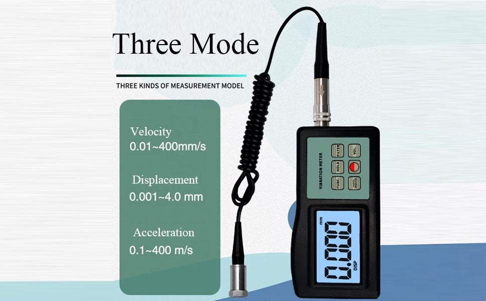 Measuring Range: Acceleration: 0.1~400m/s²Equivalent Park; Velocity: 0.01~400mm/s True RMS; Displacement: 0.001~4.0mm Equivalent Peak-peak;