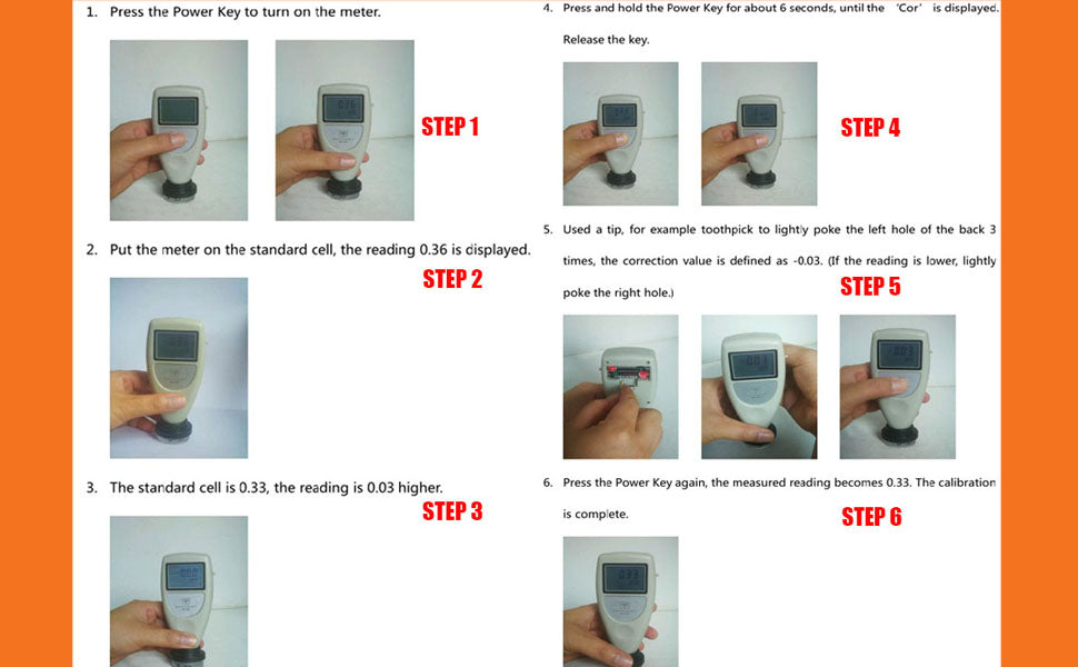 READING CORRECTION------When it is necessary to correct the reading value, press and hold the Power Key for about 7 seconds. Then release the key when the signal ‘Cor’, comes out on the display. There will be a decimal number with two places, which is the correction value. Then open the battery cover on the back, there are 2 small hole below the battery slot. Use a small hard bar (such as screwdriver) to slightly touch the key inside, the correction value will be increased or decreased .